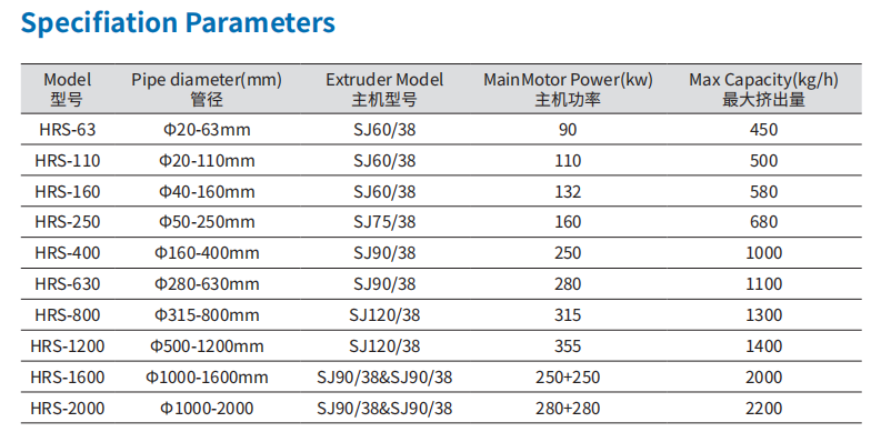 Kapasite: Maksimum 1000 kg/s kapasiteye sahip yüksek kapasiteli PE reçinesinin işlenmesi için uygun tek vidalı ekstrüder. Çap: 16 ila 800 mm. Makul tasarımı benimsemek ve güvenli üretim teknolojisini emmek, CE ve ISO sertifikaları elde etmiştir