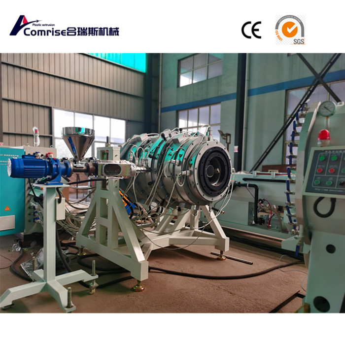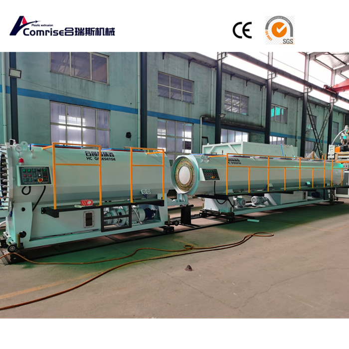Tek vidalı ekstrüder+CO ekstrüzyon makinesi+boru kalıbı+vakum boyutlandırma kutusu+soğutma sprey kutusu+altı çene paletli traktör+çipsiz kesme makinesi+flipping rafı.