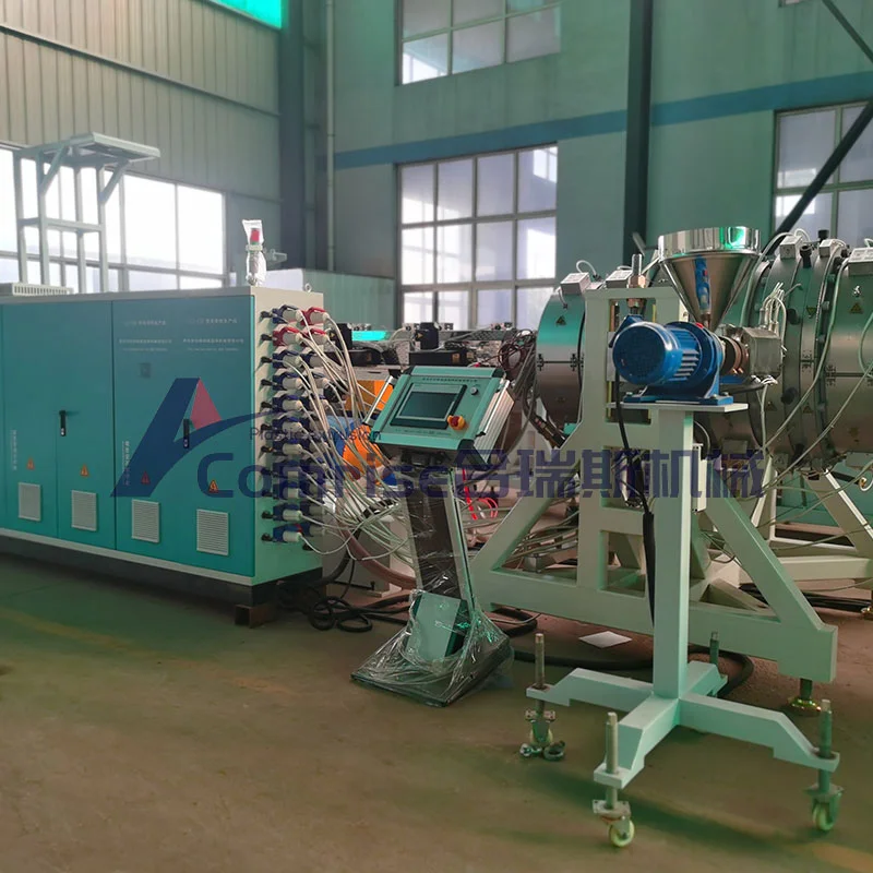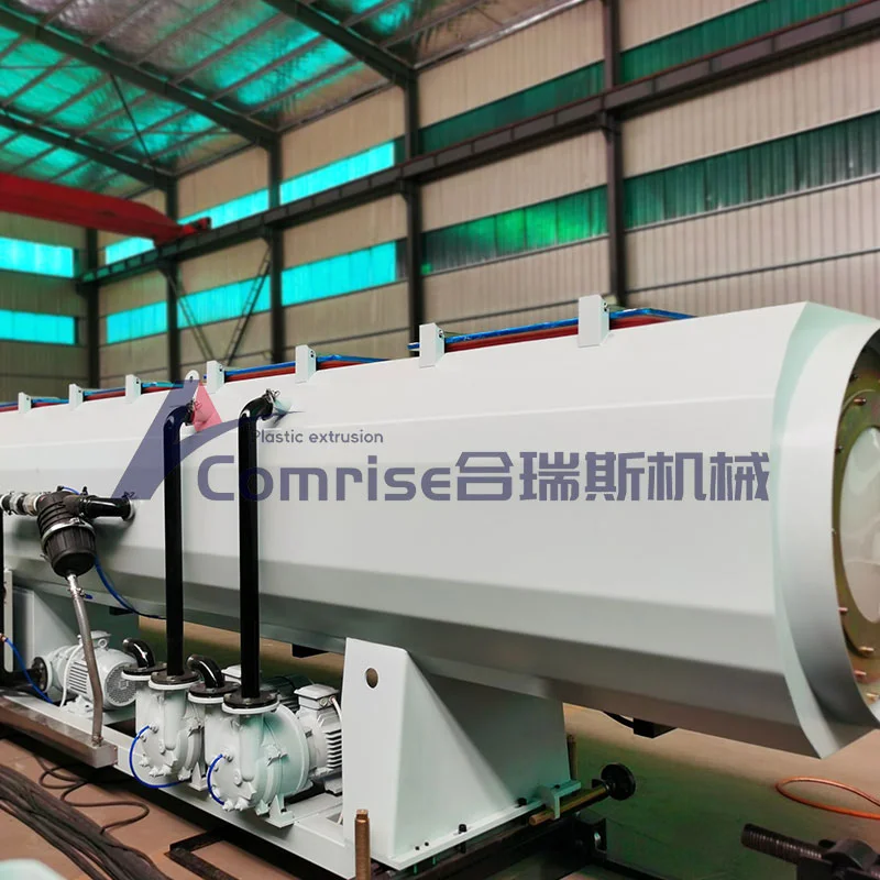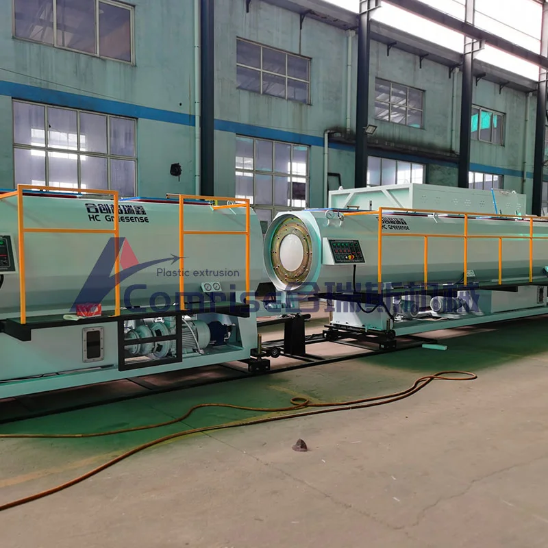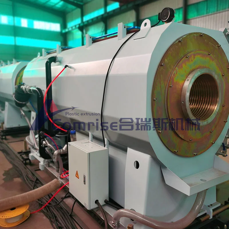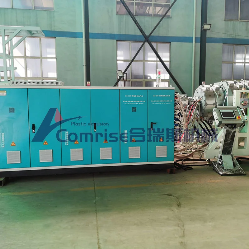 315-630mm HDPE PP boru üretim makinesi, yüksek verimli tek vidalı ekstrüder, vakum boyutlandırma su deposu, traktör, kesme makinesi ve boru braketinden oluşur.